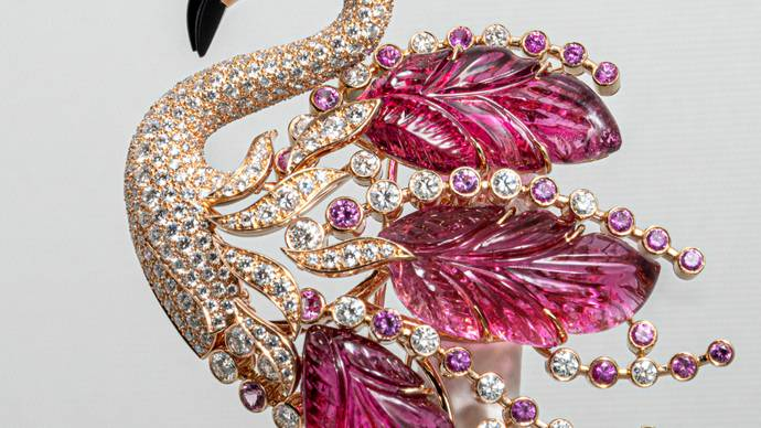 PHENICO胸针:绮丽幻象的鸟羽,粉色火烈鸟是卡地亚动物主题作品中常见的鸟类形象。这款作品在传统自然主义风格中结合部分抽象手法,火烈鸟头部雕刻逼真,玫瑰金与缟玛瑙的组合突出鸟喙形象。三颗雕刻红碧玺跃然而出,羽毛以雕刻宝石与抽象线条交错显现,意趣十足。