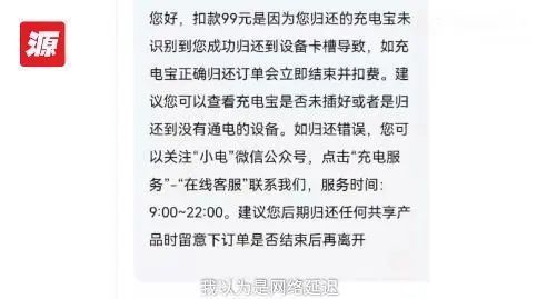 近日,陕西咸阳一网友表示,自己9月24日晚上租用小电充电宝一小时左右,归还后卡槽的指示灯有亮起,但一周后却被扣款99元。对此,充电宝客服表示,可能是机器未识别到已归还,线下维修人员之后会定时维修的。