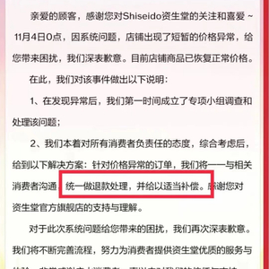 4日晚,资生堂旗舰店发布公告称,11月4日0点因系统问题,店铺出现了短暂的价格异常,针对价格异常的订单,资生堂方面将与消费者沟通,统一做退款处理,并给以适当补偿。淘宝店铺“李佳琦Austin粉丝福利社”也回应称,“目前店铺商品已恢复正常价格。针对短时内交易的价格异常订单,品牌将统一做退款处理。对于此次系统问题给您带来的困扰,我们非常抱歉,感谢MM们一直以来的支持。”