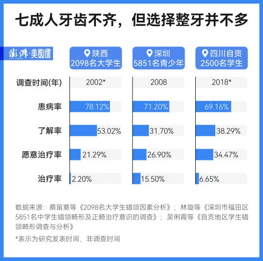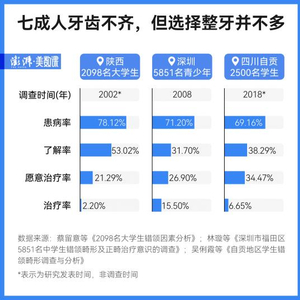 2000年,中华口腔医学会就曾在全国范围内对2万余名儿童和青少年进行错颌畸形的调查,结果显示,67.82%的被调查对象有不同程度的错颌畸形。随后在全国不同地区、不同时间进行的调查或多或少佐证了上述结果,且都呈现出这样的趋势:患病率高,了解率和治疗率却不高。