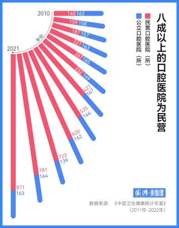 这就不得不提正畸所在的这个领域:口腔科是民营化、市场化最高的医疗行业,且大部分服务都没有纳入医保。根据《中国卫生健康统计年鉴》,中国八成以上的口腔医院为民营,这还不包括星罗棋布的私人口腔诊所。