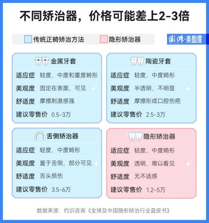 相比于传统的金属牙套,隐形正畸因为没有传统矫治过程中的钢丝和托槽,透明不影响牙齿美观而逐渐受到大家青睐,但售价也高出不少。相比一些国产金属牙套几千元的价格,有的进口隐形矫治器售价能超过5万元。