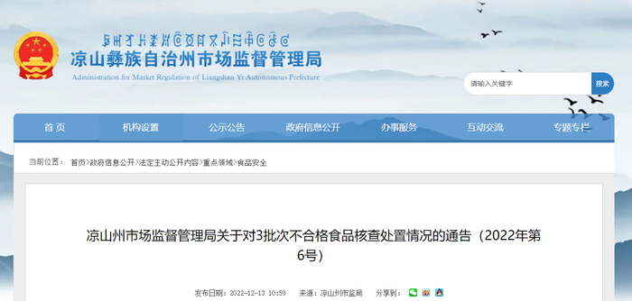 凉山州市场监督管理局关于对3批次不合格食品核查处置情况的通告(2022年第6号)