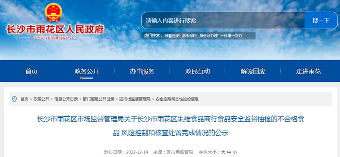 长沙市雨花区市场监督管理局关于长沙市雨花区朱维食品商行食品安全监督抽检的不合格食品 风险控制和核查处置完成情况的公示