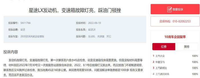 据车主描述,他于2020年7月购买了这台2020款乘风破浪星睿版星途品牌的汽车,在使用至今年7月时,发动机故障灯亮、变速箱故障灯亮。唐先生在投诉中说:“第一次联系到六盘水4S店检查,说是变速箱伐体需要更换。但是没有材料需要等待,材料到后2022年7月30号又一次跑服务站更换伐体这些,2022年8月1号后故障灯又跳出来。而且加油门不顺畅更明显,联系售后又叫我开过去检查......”此外,唐先生说自己“离4S店160多公里。来回费用需要500多。问题没解决单路费都是1000多,现在又要求去。而且说不去就没办法。”在这样的情况下,唐先生无奈,遂将该问题投诉至中国投诉-全国缺陷产品投诉平台。