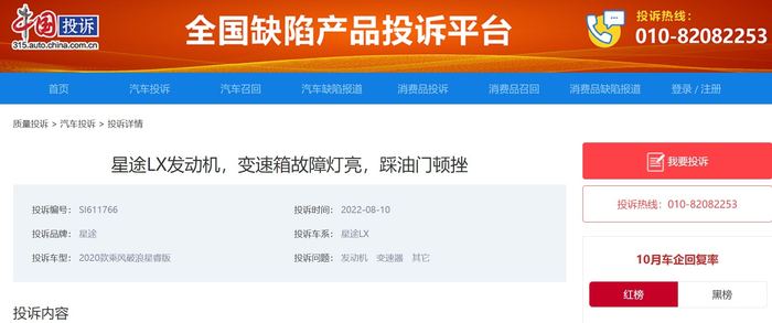 中国网汽车12月26日讯 (记者 朱古力)中国投诉-全国缺陷产品投诉平台(https://315.auto.china.com.cn/)不久前接到星途车主唐先生的投诉,称“星途LX发动机,变速箱故障灯亮,踩油门顿挫”。