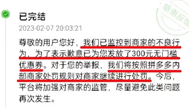 紧接着,女生向平台举报了该店铺。后经平台核查,监控到了商家的不良行为,向女生发放了300元无门槛优惠券,并将按照平台规则对商家继续进行处罚。