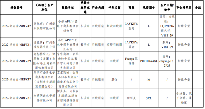 此外,上海彩羊服饰有限公司生产的“恒源祥”、广州秦禾服饰有限公司生产的“LAYKEY/蓝奇”等品牌的羽绒服,检出纤维含量不足。