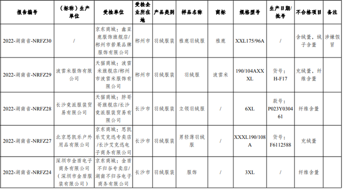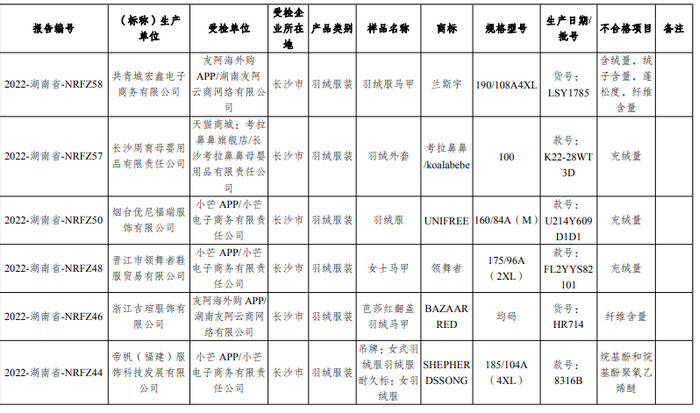“鸭鸭”羽绒“充绒量”不合格,“恒源祥”羽绒服检出纤维含量不足……湖南省市监局近日通报2022年第三批重点工业产品质量省级监督抽查情况。