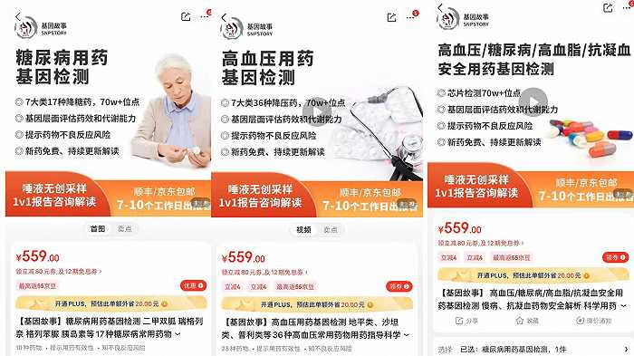 在某电商平台一家名为“基因故事”的官方旗舰店中,就设有针对糖尿病用药的基因检测,并且,二甲双胍、瑞格列奈、胰岛素等糖尿病常见药物均在检测项目中,该项目的近期售价为559元。
