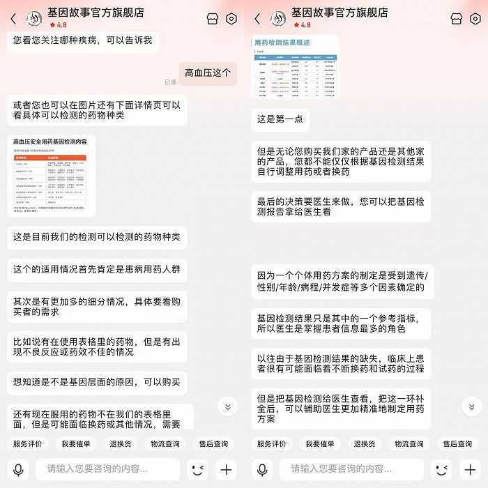 以高血压用药为例,该旗舰店客服人员介绍,这样的项目主要适合用药人群,尤其是用药过程中发现效果不佳,疑虑是否是基因问题的患者;或者是,想要换药时,需要提前评估用药优劣以及风险的人群,都可选择进行检测。简单来说就是,在不确定药是否有用的时候,都可检测。