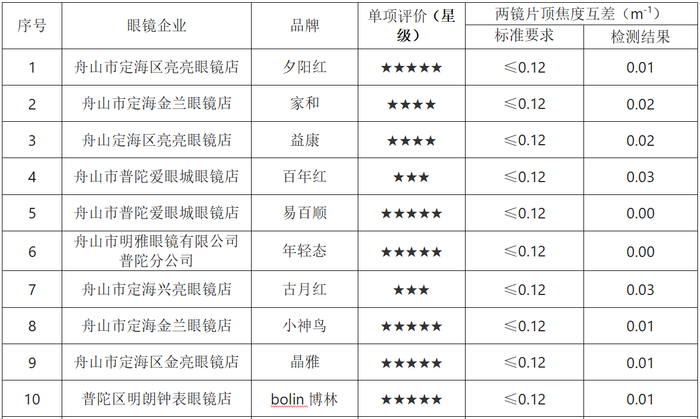 两镜片顶焦度互差是指左、右两个镜片度数的差值。对于成品批量生产的老视镜,左右两镜片的度数是一样的。如果该差值过大,会造成佩戴者左右眼视物清晰度不一致,一只眼清楚、一只眼模糊,从而导致视力疲劳。经检测,20款样品的两镜片顶焦度互差,19款均符合国家标准GB13511.1、GB/T13511.3的要求,其中,舟山市定海区好视清眼镜店一款“九九红”品牌样品,两镜片顶焦度互差值超出标准要求。