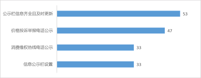 从体验式调查中所有二级指标落实情况来看,卖场管理(46.7分)、消费维权信息公示(41.7分)、停车场(52.2分)和服务配套(49.3分)这四方面家居卖场落实情况较差。其中,构成消费维权信息公示的三级指标中,消费维权热线电话公示和信息公示栏设置两项指标,部分卖场落实情况较差,需进一步规范。