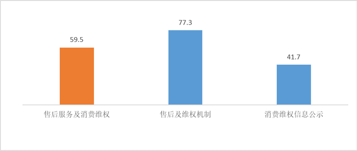 售后服务与消费维权落实情况较差,得分59.5分。消费维权信息公示落实不到位,得分较低,仅有41.7分,存在较大改进空间;卖场售后及维权机制得分77.3分,表现一般。