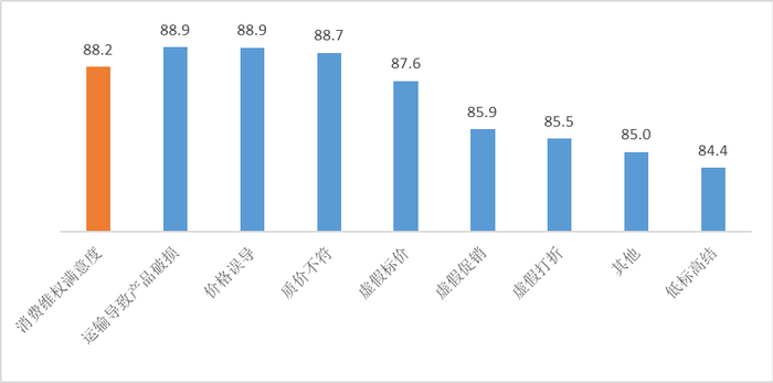 消费维权总体满意度得分88.2,表现优秀,其中消费者对运输导致产品破损、价格误导、质量价格不符、虚假标价、虚假促销、虚假打折等问题的维权结果表示满意,得分均在85分以上,表现优秀。但低标高结相关问题的维权满意度得分为84.4分,相较于其他指标表现较弱。在消费者遇到低标高结情况时,商家、卖场的处理手段、进度、结果与消费者预期存有一定差距,如处理周期长、举证程序烦琐等。