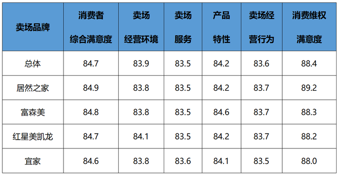 从不同品牌家居卖场调查结果来看,各品牌卖场总体满意度得分均在80分以上,整体表现良好。其中,红星美凯龙在“卖场经营环境”指标得分84.1分,表现突出;宜家的“卖场服务”方面表现独树一帜,得分83.6分;居然之家在“消费维权满意度”方面得分89.2分,优势明显;富森美在“产品特性”方面更有优势,得分84.6分。