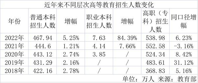 从生源结构来看,高层次人才培养规模在扩大。数据显示,2018年至2021年,普通本科招生人数增幅保持在1%-2%左右,但2022年同比大幅增长5.25%,显示出更多考生倾向于接受层次更高的本科教育。