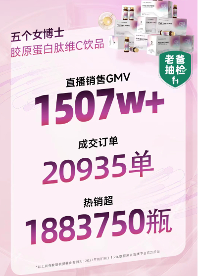 8月17日,新锐口服美容品牌五个女博士携品牌产品亮相老爸去评测直播间,累计成交超20000单,销量GMV超过1500w。如此亮眼的成绩,也彰显了五个女博士品牌强大的市场竞争力。