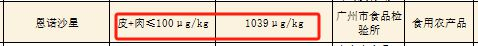 本次涉事的鲜活鲈鱼检测出的恩诺沙星结果高达1039ug/kg,而标准值是“皮+肉≤100ug/kg”,超标近乎10倍。