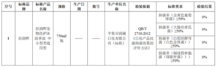 佰润晖宠物洗护沐浴香波的样品抑菌率不达标。