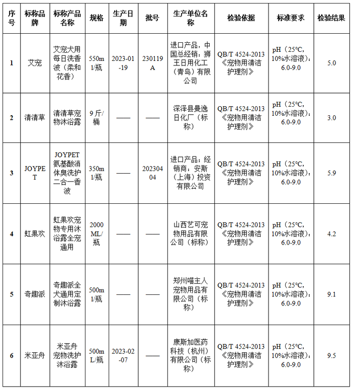 艾宠、青青草等6款样品pH值不达标