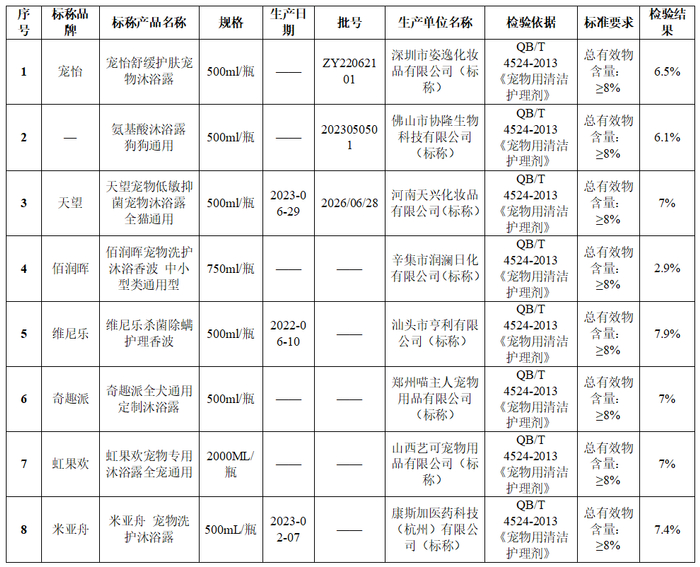 本次比较试验的40款样中,宠怡、佰润晖、维尼乐等8款样品的总有效物含量低于QB/T4524—2013《宠物用清洁护理剂》的标准要求,可能达不到清洗效果。