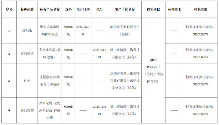 本次比较试验还发现有4款样品的标签标注不规范。其中,维尼乐、佳伦2款样品标签标注的执行标准为GB/T29679,养只宠物的2款样品标签标注的执行标准为GB/T34857。GB/T29679—2013《洗发液、洗发膏》是适用于以表面活性剂为主要活性成分复配而成的、具有清洁人的头皮和头发、并保持其美观作用的洗发液和洗发膏产品;GB/T34857—2017《沐浴剂》是适用于以表面活性剂为有效成分配制的,用于人体肌肤清洁的产品,两者并不适用于宠物。