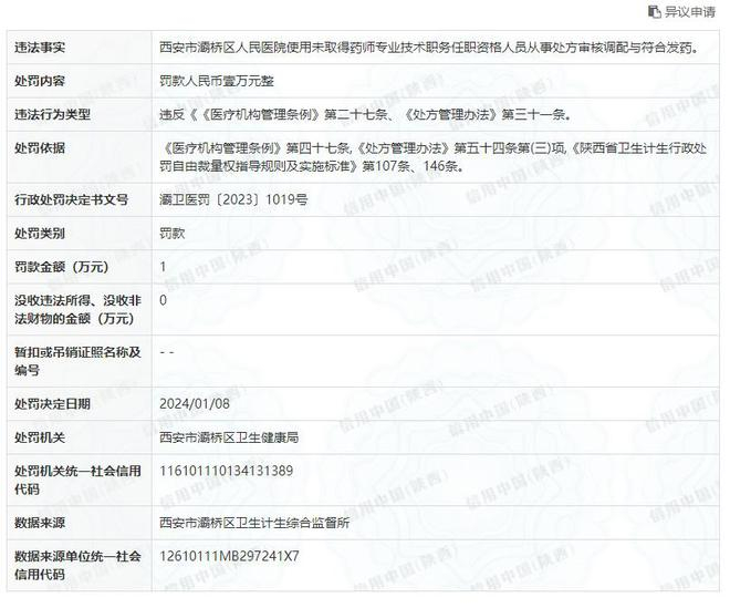 西安灞桥医院一天收两张罚单,存在处方调配人员无资格等违规