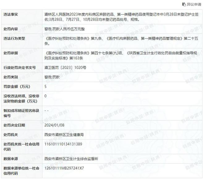 灞卫医罚〔2023〕1020号处罚文书显示,西安市灞桥区人民医院2023年度内科病区麻醉药品、第一类精神药品使用登记本中3月28日未登记护士签名;3月28日、7月27日、10月28日均未登记药品批号、规格,违反《医疗机构麻醉药品、第一类精神药品管理规定》等规定,西安市灞桥区卫生健康局依据《医疗纠纷预防和处理条例》、《陕西省卫生计生行政处罚自由裁量权指导规则及实施标准》对其罚款5万元。