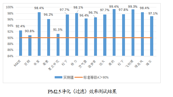在PM2.5净化(过滤)效率方面,GB/T34012—2017将PM2.5净化效率分为A(>90%)、B(>70%、≤90%)、C(>50%、≤70%)、D(>20%、≤50%)4个等级,且实测值不应小于标称值的95%;GB/T21087—2020规定,ERV(热回收新风机组)的新风PM2.5过滤效率实测值不应小于额定值的95%。比较试验结果显示,15款样品的PM2.5净化(过滤)效率均达到90%以上,其中6款带热回收功能新风机样品均达到97%以上。