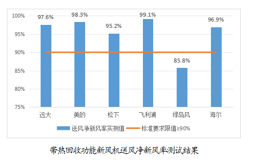 送风净新风率是指带热回收功能新风机的送风中含有的室外空气体积流量与送风量之比,送风净新风率越高,表示进入室内的洁净空气量更大。GB/T21087—2020要求,送风量不大于3000m3/h的ERV(热回收新风机组),其送风净新风率实测值不应小于90%。比较试验结果显示,6款带热回收功能新风机样品中,5款送风净新风率在95%以上,1款标称品牌为“绿岛风”的样品为85.8%,低于标准要求。