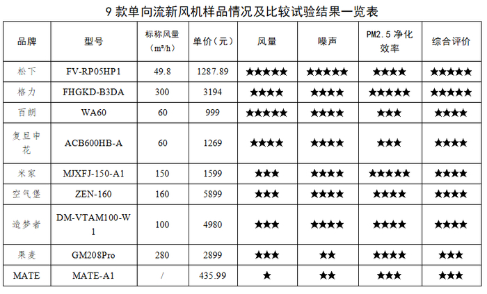 本次比较试验15款样品中,有9款是单向流新风机,其工作原理是将室外空气过滤后送入房间,使室内气压略高于室外,以此将污浊空气通过缝隙排出室外;对这9款样品的测试包括风量、噪声、PM2.5净化(过滤)效率。另外6款样品是带热回收功能的双向流新风机,其可以通过送风口、出风口吸排空气,无需打开窗户即可完成循环,且在冬夏温差较大时,热回收功能可通过热交换使室内外的冷热空气温度得到中和,从而减小新风与室内空气的温差;对这6款样品的测试包括风量(送风量、排风量)、噪声、新风PM2.5过滤效率、送风净新风率及冷量、热量回收全热交换效率。