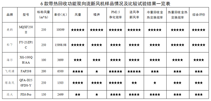在冷量、热量回收全热交换效率方面,GB/T21087—2020要求,全热交换效率实测值不应小于额定值的90%,且冷量回收≥55%、热量回收≥60%。对6款带热回收功能新风机样品的测试结果显示,5款符合标准要求,1款标称品牌为“绿岛风”的样品冷量回收全热交换效率实测值为42.7%,且小于其标示额定值(64%)的90%,达不到标准要求。