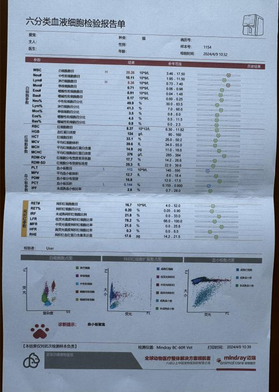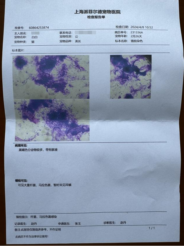 由于担心猫咪身体状况,加上对方的回复不专业,4月8日吴先生将猫咪带到宠物医院检查。“检查报告显示,黑褐色分泌物较多,带有脓液。除此之外,下巴和后背均有猫癣。”