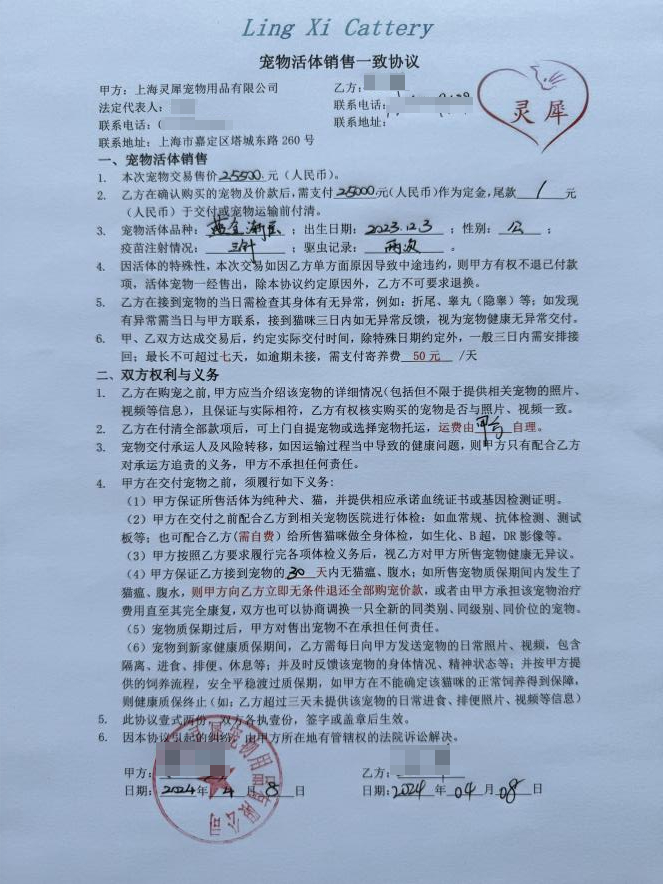 吴先生还向澎湃新闻提供了与灵犀猫舍签订的合同,“对方承诺提供相应的血统证书或者是基因检测证明。但购买至今对方也没有提供,也没有提供相关健康证明,只针对合同中提到的猫瘟、肺水两项做了承诺。