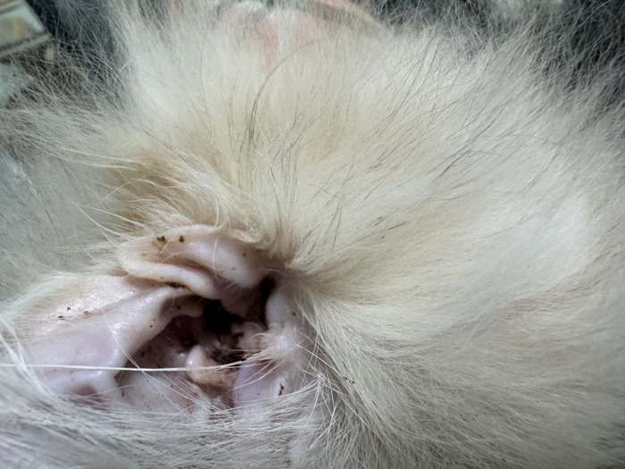 4月7日也就是买猫咪的第二天,吴先生发现猫咪耳朵里全是黑色的污垢。仔细查看后还发现猫咪下巴有一块地方没有毛,“我怀疑是猫癣。”