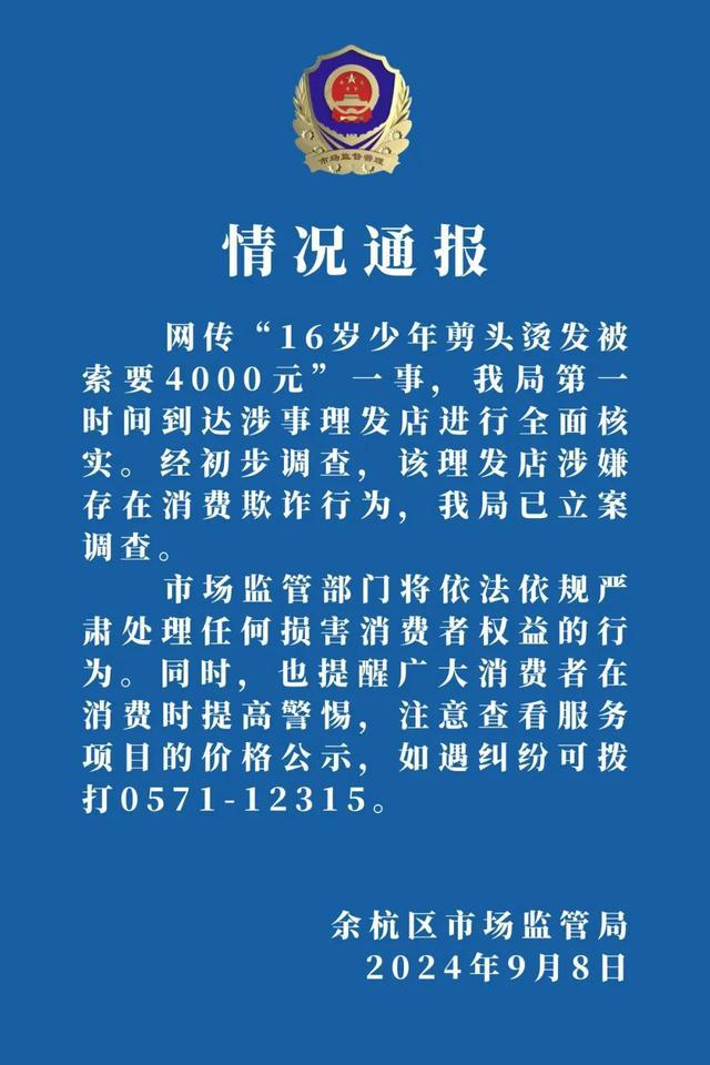对此,9月8日,浙江杭州余杭区市场监管局发出情况通报。通报称,在对涉事理发店进行全面核实后,已确认该理发店涉嫌存在消费欺诈行为,目前已立案调查。市场监管部门表示,将依法依规严肃处理任何损害消费者权益的行为,并提醒广大消费者在消费时提高警惕,注意查看服务项目的价格公示。