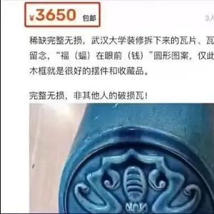 有媒体搜索发现,在某二手平台上,武汉大学琉璃瓦片最高被炒至3650元。其简介显示,“稀缺完整无损,武汉大学装修拆下来的瓦片、瓦当、琉璃瓦留念,‘福(蝠)在眼前(钱)’圆形图案,仅此一块。完整无损,非其他人的破损瓦!”其余武汉大学琉璃瓦片的售价为15元至660元不等。