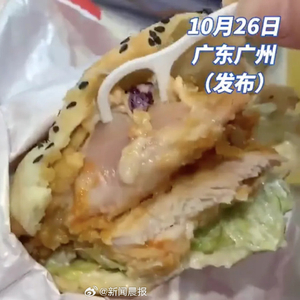 10月26日,广东广州,有网友发布视频曝光塔斯汀中国汉堡吃出生肉。据网友曝光的视频,汉堡的中间肉排部分存在部分未熟的鸡肉。