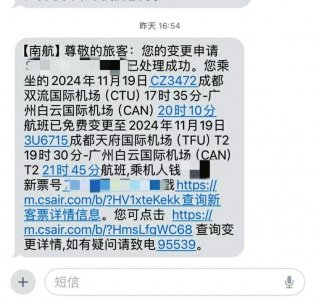 南航向钱女士发送的乘机变更信息。