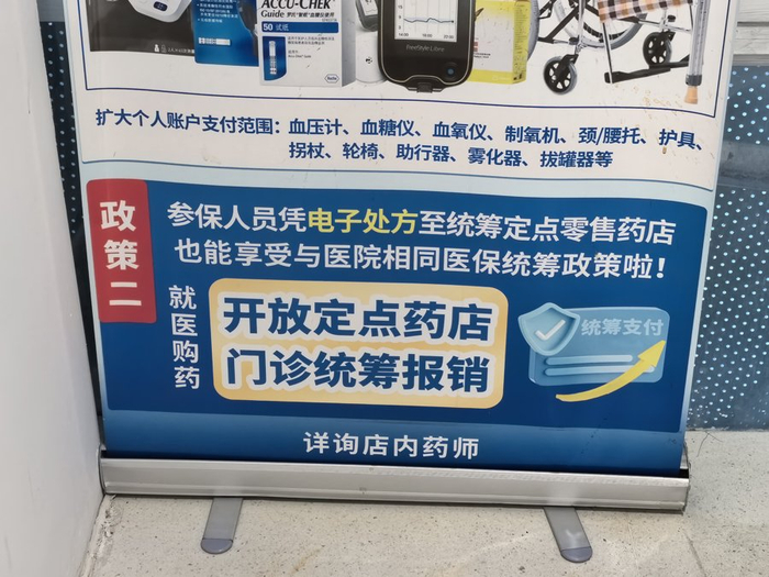 第一医药商店内楼梯转角处的易拉宝宣传海报上宣传了电子处方购药的相关医保政策。