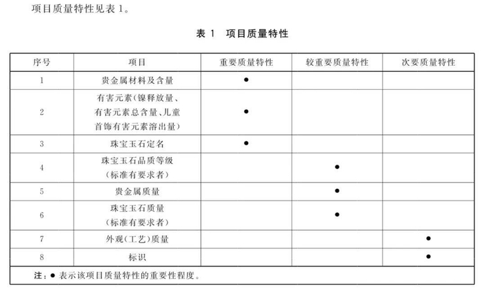 依据单位产品质量特性的重要性或质量特性不符合的严重程度,可将不合格分为:A类不合格(重要质量特性不符合规定/较重要质量特性严重不符合规定)、B类不合格(较重要质量特性不符合规定/次要质量特性严重不符合规定)和C类不合格(次要质量特性不符合规定)。当中,贵金属材料及含量、有害元素、珠宝玉石定名属于“重要质量特性”。