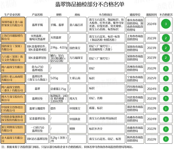此外,根据各地市场监管部门公布的抽检结果,周六福、七彩云南、周大生、中国珠宝、中国黄金、明牌、金大福等知名珠宝品牌旗下翡翠饰品近三年均存在不合格情况,主要问题集中在标识、印记和珠宝玉石定名等方面。