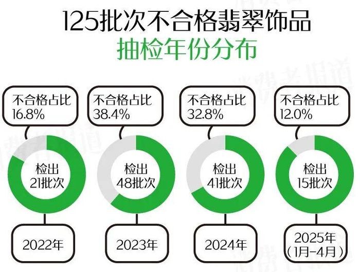 从具体年份看,2023年、2024年抽检出不合格翡翠饰品较多,共占不合格总批次的近七成。