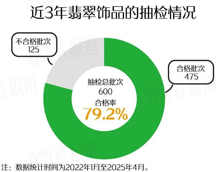 近日,《消费者报道》整理了2022年1月至2025年4月期间国家及省级市场监督管理局通报的关于翡翠饰品的质量抽检情况。结果显示,近3年,各地监管部门一共抽检翡翠饰品600批次,其中发现不合格翡翠饰品125批次,整体合格率为79.2%