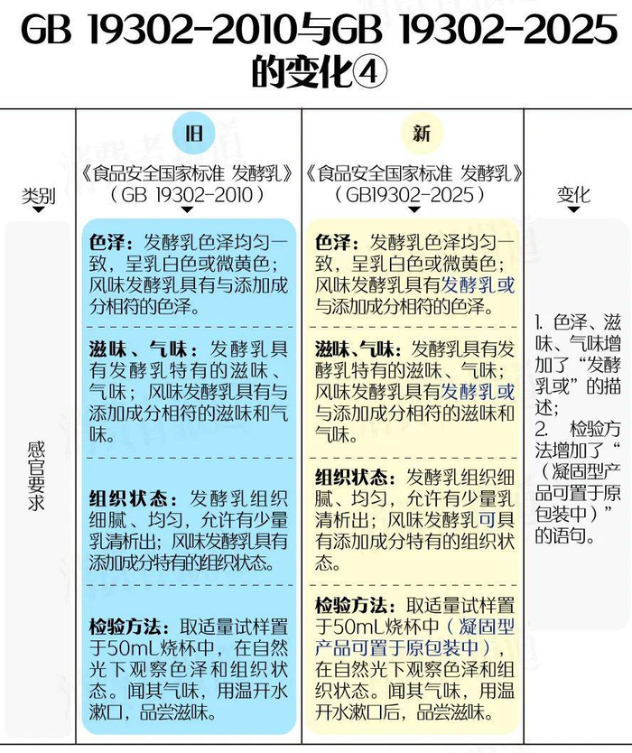 《食品国家安全标准 发酵乳》(GB 19302-2025)对色泽、滋味、气味增加了“发酵乳或”的描述,感官指标的检验方法增加了“凝固型产品可置于原包装中”的规定,相对更人性化了。因为旧标准对于凝固型产品(如老酸奶)的感官检验,需要倒出至平皿,但是倒出检验可能导致乳清析出(影响组织状态评分)或凝胶网络断裂(导致不存在的“颗粒感”判定),新标准可置于原包装中检验感官,避免了这种失真的误判。