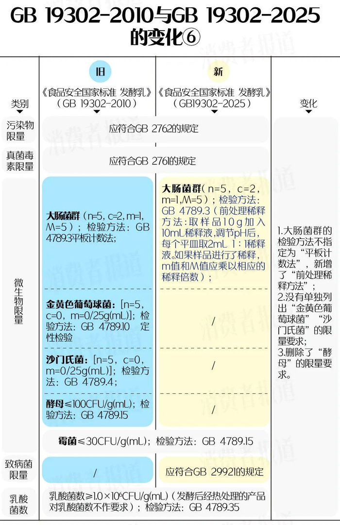 《食品国家安全标准 发酵乳》(GB 19302-2025)没有单独列出“金黄色葡萄球菌”“沙门氏菌”的限量要求,改为引用GB 29921的规定,要求一致。
