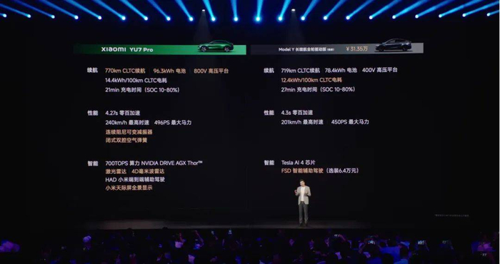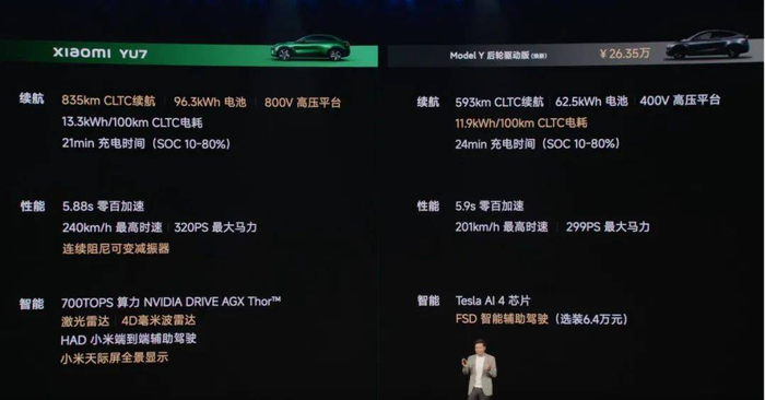 在此次发布会上,雷军也多次将小米YU7与特斯拉Model Y进行对比。小米汽车提供的数据显示,与特斯拉Model Y焕新版相比,小米YU7在轴距、续航里程、充电时间、性能硬件配置、辅助驾驶硬件配置等方面均优于对方。