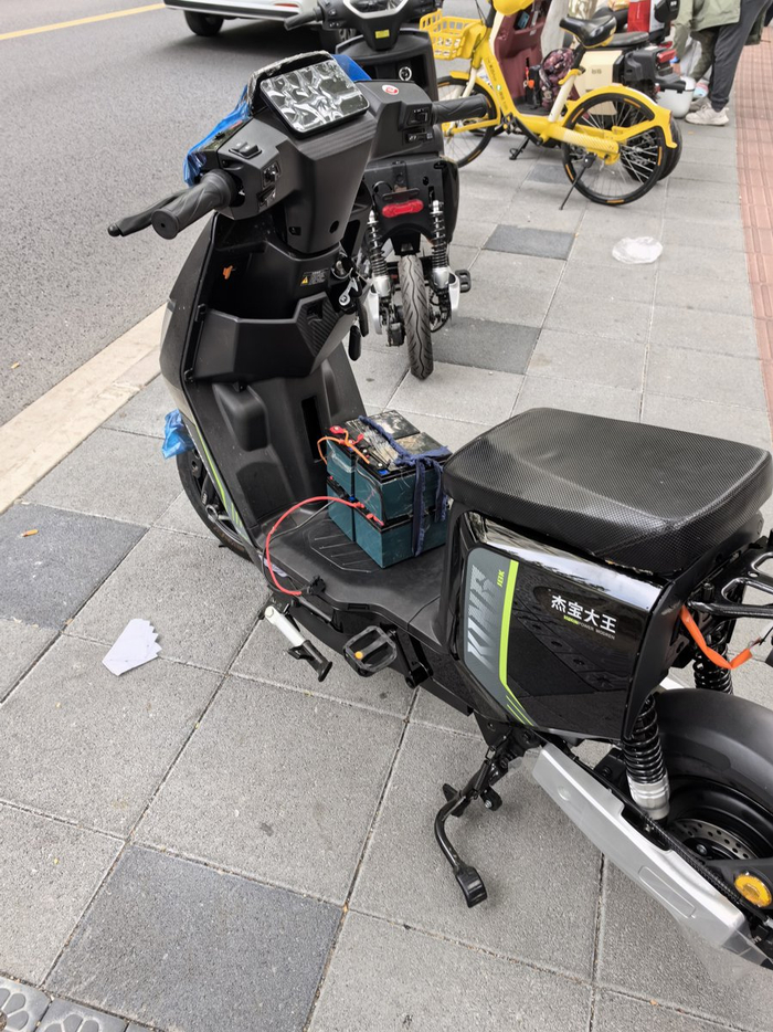 现场“换电过检”几乎已是“明规则”。10时50分,又一车行老板领着两辆“小牛”电动自行车前来上牌,几乎是一样的操作模式,车上原配有的“48V30AH”大锂电被拆在一旁,而用于验车的是一款长条形“48V12AH”小电池,两者大小迥异。或许是临近中午休息时间,车行老板索性就在派出所大院里操作起了改装,换完电池后,只见老板将两只脚踏简单塞入两边的孔洞里,就催促着车主推着去验车。