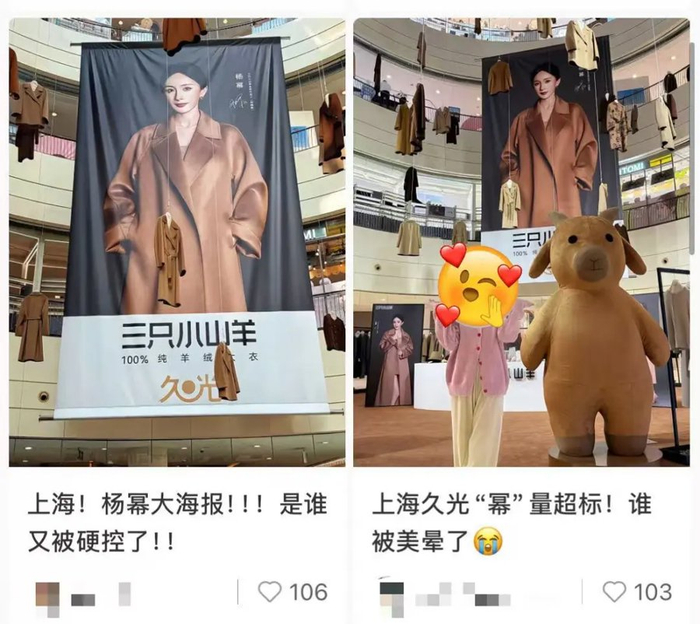 从商场工作人员处了解到:这是杨幂代言的高端羊绒品牌“三只小山羊”的新店宣传展陈,从11月28日开始,一直到12月15日结束。